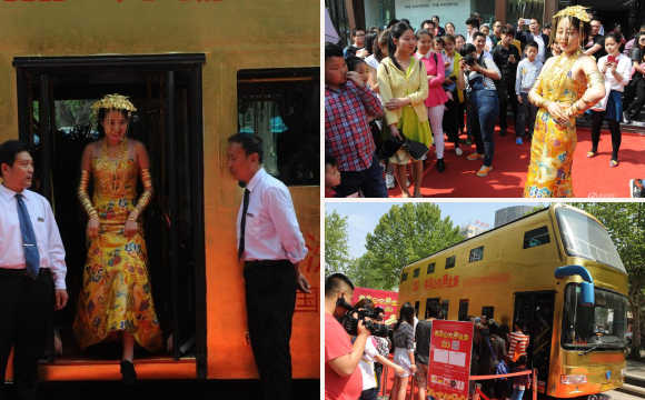 4月25日,一輛“黃金公交車”亮相山東濟(jì)南。據(jù)介紹,該公交車80%的部分都貼了金箔,“黃金美女”模特身上佩戴的黃金飾品價(jià)值兩百萬(wàn),公交車車內(nèi)掛滿了數(shù)千件黃金飾品,重達(dá)幾十公斤,總共價(jià)值500余萬(wàn)。(來(lái)源:騰訊新聞 陳寧/CFP)