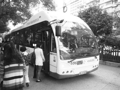 昨日,記者來到卓刀泉南路方家嘴公交車站,這里是596路的起點站。15分鐘后,一輛漂亮的新能源白色公交車開進了站點(如右圖)。這輛公交車外觀和普通公交明顯不同,車身以白色為主,前車窗占整個車頭前面的一半,車廂兩側的車窗也占車身高度的一半,從外觀上看,比普通公交車要大得多。