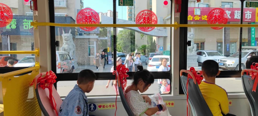 車(chē)窗貼著象征愛(ài)情的“囍”字剪紙