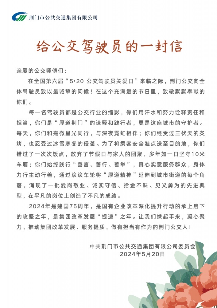 為倡導(dǎo)社會關(guān)愛公交駕駛員,營造理解、尊重公交駕駛員的良好氛圍,5月20日,市公交集團(tuán)以“全國公交駕駛員關(guān)愛日”為契機(jī),通過一系列關(guān)愛駕駛員的活動,為公交駕駛員們送上節(jié)日祝福和關(guān)愛。
