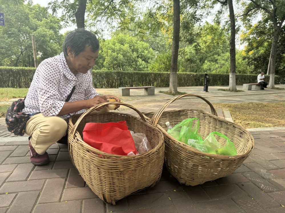 臨近正午,石大娘削著梨果充饑,等待回家公交車到來(lái)。