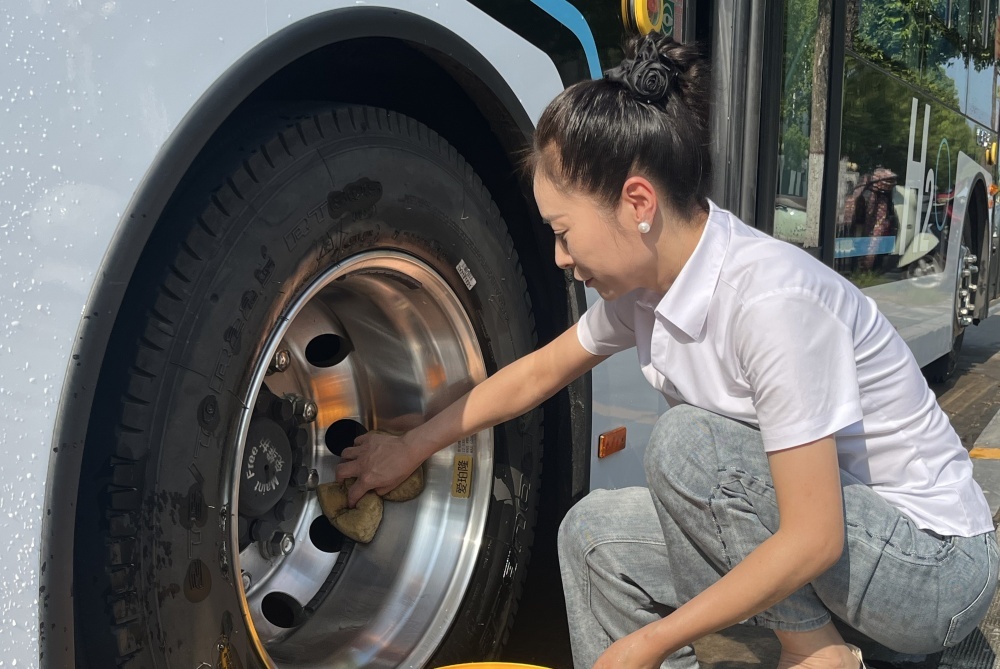大太陽底下,他仔細檢查每一處,就為了保障公交車能順順當當跑。