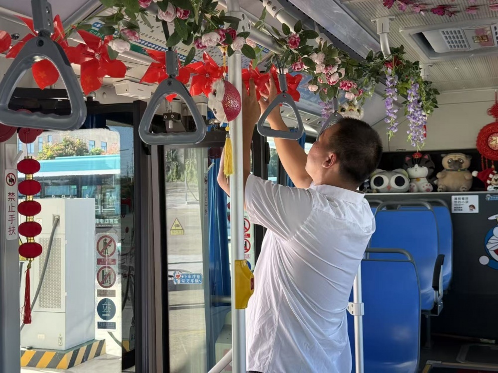 張峻峰是荊門公交2024年度“最美公交人”,他的車上總比別人多點(diǎn)“暖心”東西:駕駛座旁的小盒子里備著暈車藥、創(chuàng)可貼和折疊傘?!敖衲陣鴳c,就想乘客上車能樂呵樂呵?!庇谑菑埦寰蛣恿搜b飾車廂的念頭。他自費(fèi)買了小國旗、風(fēng)車、燈籠等裝飾,晚上在家剪剪貼貼,白天利用休息時(shí)間在車上裝飾。張峻峰的行動,也是荊門公交服務(wù)提升的一個縮影。
