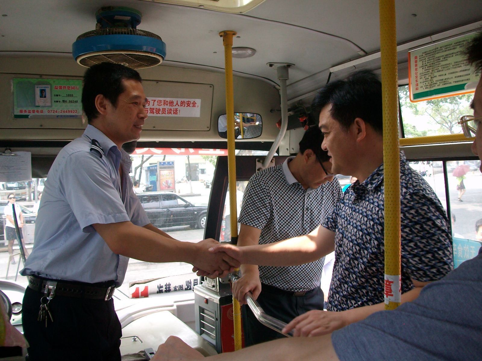 伍應(yīng)彪(右)與公交駕駛員親切握手