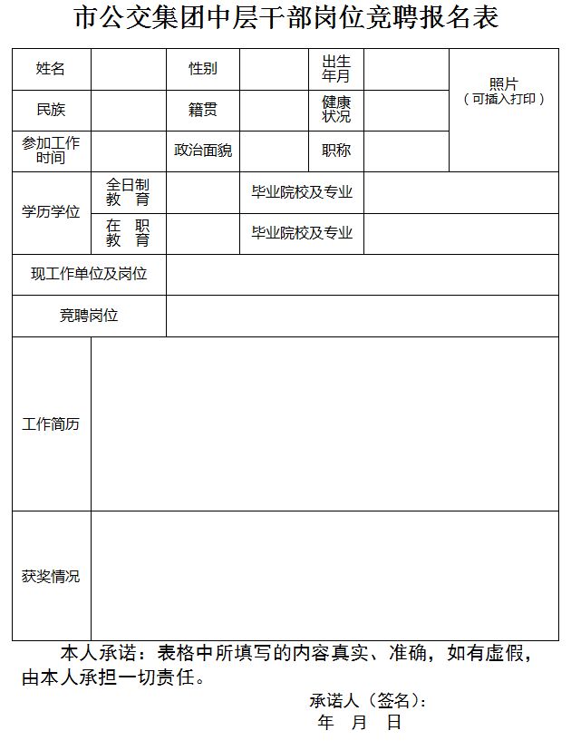 2.報名方式為現(xiàn)場、網(wǎng)上兩種方式。可登陸荊門市公共交通集團(tuán)有限公司網(wǎng)站,下載《市公交集團(tuán)中層干部崗位競聘報名表》并填寫,