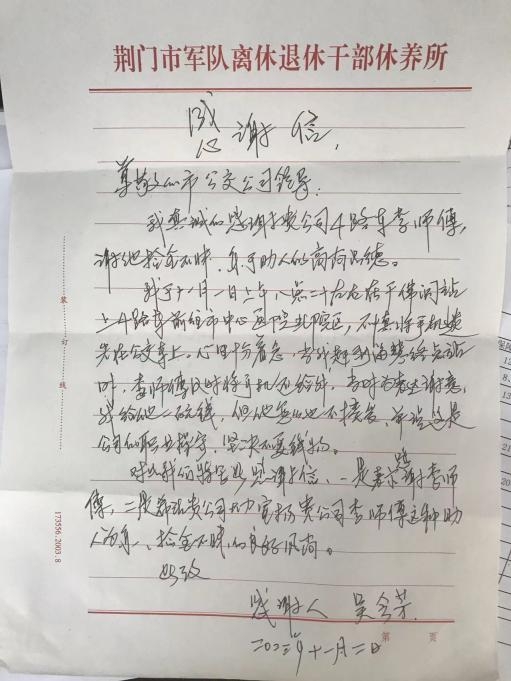 11月6日上午9時,公汽三公司收到由調度中心代收的一封感謝信,信中寫到“我真誠的感謝貴公司4路車李師傅,謝他拾金不昧。樂于助人的高尚品德”。
